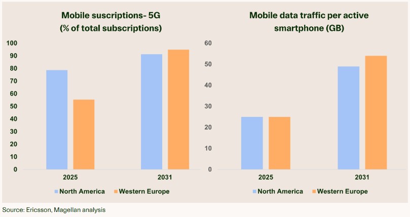 These companies have a solid, sustainable outlook for revenue growth, reflecting the insatiable demand for mobile data everywhere (estimated at 12-13% CAGR in Western Europe and the US through 20311 ). While we anticipate further consolidation from telcos (particularly in Europe), strong contracts, the potential for government-mandated investment, and improving return economics for the remaining telco players (which should allow them to invest in their networks) mean the tower companies should be able to continue to generate solid cash flow and returns to investors. Examples of companies we invest in include US tower companies American Tower and Crown Castle and European communications infrastructure company Cellnex.